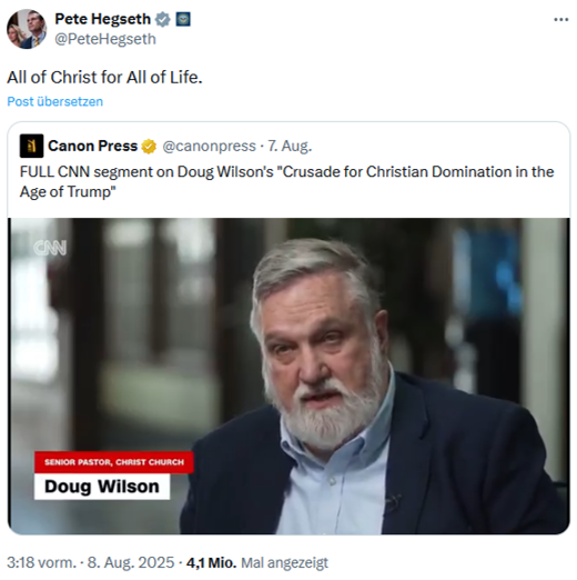 Gerade hat der US-Verteidigungsminister Pete Hegseth ein Video über eine christlich-nationalistische Kirche geteilt, in dem sich mehrere Priester gegen das Wahlrecht für Frauen aussprechen: