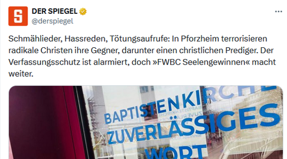 - „In Pforzheim terrorisieren radikale Christen ihre Gegner“, schildert der Spiegel: