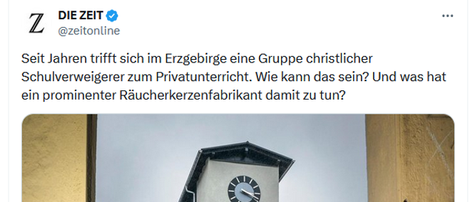 - Im Erzgebirge trifft sich seit Jahren eine Gruppe christlicher Schulverweigerer zum Privatunterricht, heißt es in der Zeit. Zentrale Figur dabei ist der Räucherkerzenfabrikant Jürgen Huss: