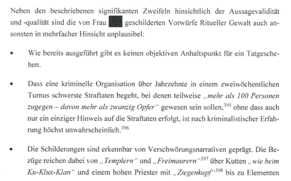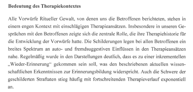Die in diesen Therapien vertretene Rituelle-Gewalt-Theorie ist für die Kanzlei Feigen · Graf „eine nur scheinbare Erklärung, die den Betroffenen einen Ausweg aus Trauma und Hilflosigkeit vorspiegelt und ihre Lage aus unserer Sicht erheblich verschlimmert hat“.