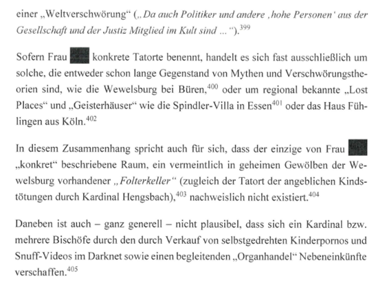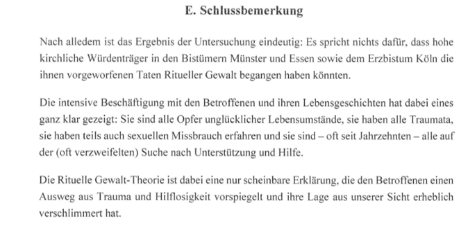 Das 166-seitige Gutachten der Rechtsanwälte Dr. Matthias Sartorius und Dr. Niklas Kindhäuser bündelt allerdings wie unter einem Brennglas die Problematik der Rituelle Gewalt-Mind Control-Verschwörungstheorie (RG-MC), auf die wir seit langem hinweisen. Und zwar so überzeugend, dass das Bistum Münster in einer Stellungnahme erklärt: