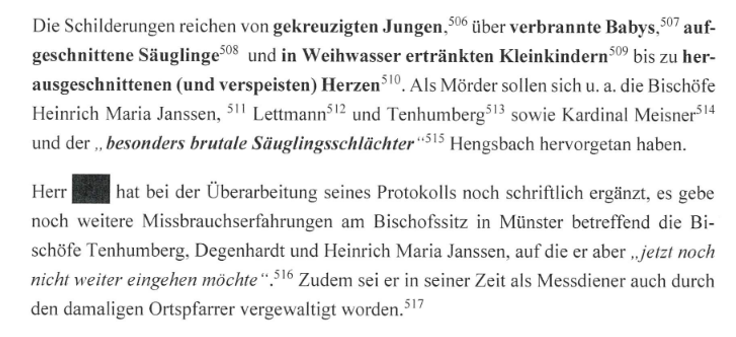Sie sollen organisierten Täternetzwerken angehört haben, die „schwerste Gewalttaten mit rituellen Bezügen“ begangen hätten. Das jedenfalls behaupteten in den vergangenen drei Jahren ein Dutzend Personen. Das Bistum Münster beauftragte daraufhin im April 2024 die Kanzlei Feigen · Graf mit einer Untersuchung. Im Juli 2024 und Januar 2025 schlossen sich das Bistum Essen und das Erzbistum Köln der Überprüfung an. Dabei wurden Unterlagen ausgewertet, Gespräche mit den Betroffenen geführt und aussagepsychologische Gutachten (Prof. Silvia Gubi-Kelm, Dr. Petra Wolf) erstellt.