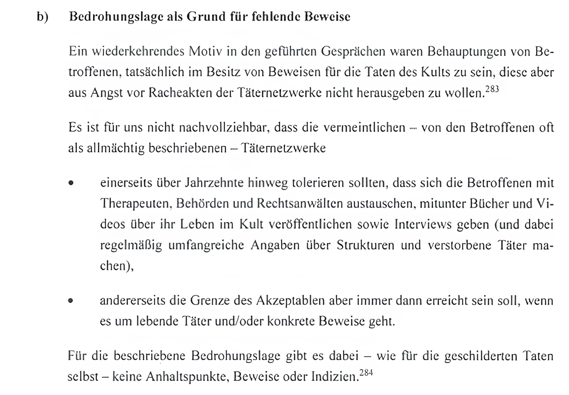 Die Untersuchung hat keinen einzigen belastbaren Hinweis auf die beschriebenen Vorwürfe Ritueller Gewalt und die beschriebenen organisierten Täternetzwerke erbracht. Allen Betroffenenaussagen ist das vollständige Fehlen konkreter objektiver Nachweise gemeinsam.