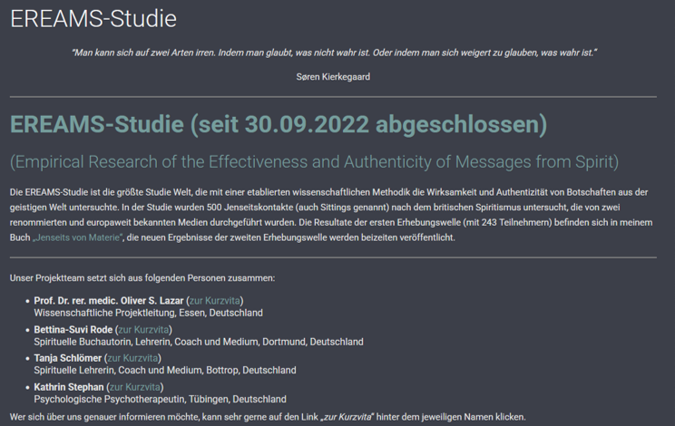 EREAMS will zum einen „Botschaften aus der geistigen Welt“ und zum anderen das „Weiterleben unseres Bewusstseins auch nach dem physischen Tod“ bewiesen haben – und das mit „höchst signifikanten Ergebnissen“.