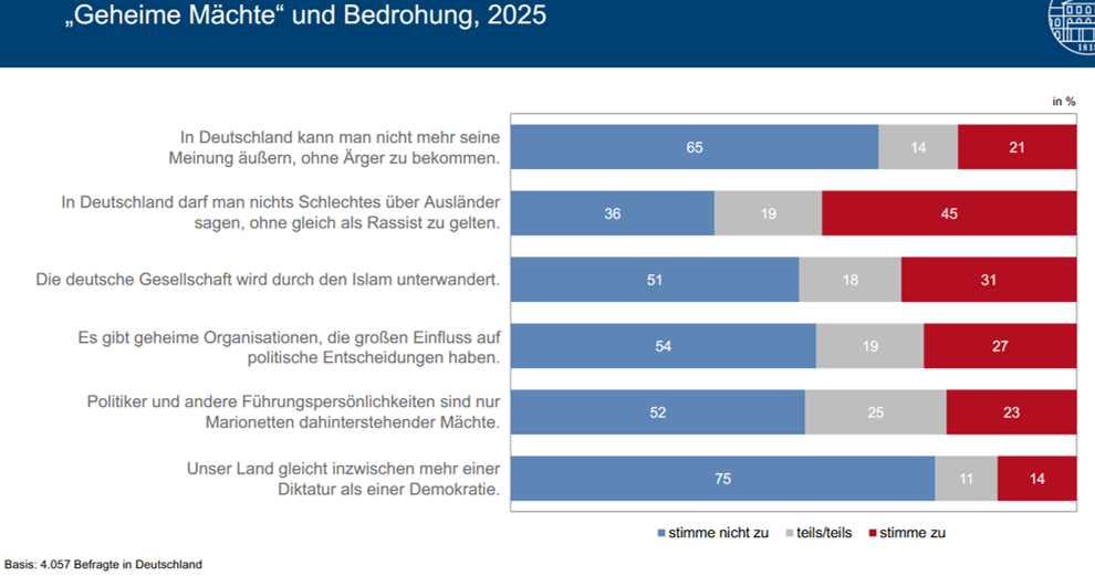 Gut ein Viertel der Deutschen glaubt, dass Politik in Deutschland von „geheimen Mächten“ gesteuert werde. Sie stimmen der folgenden Aussage zu: „Es gibt geheime Organisationen, die großen Einfluss auf politische Entscheidungen haben.“