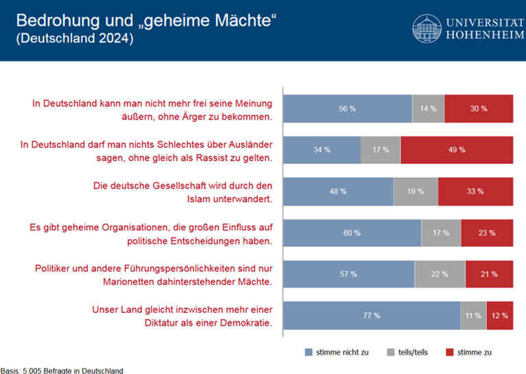 Das zeigt das „Demokratie-Monitoring“ 2025 der Universität Hohenheim in Stuttgart. Damit bleibt die sogenannte Verschwörungsneigung weitgehend konstant.