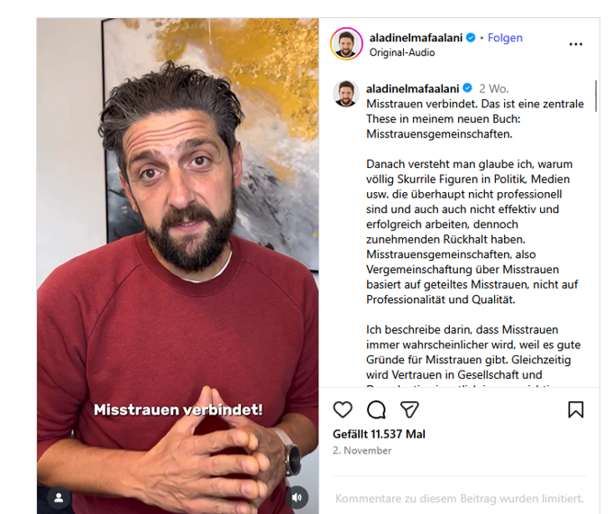 - El-Mafaalani, Aladin „Misstrauensgemeinschaften: Zur Anziehungskraft von Populismus und Verschwörungsideologien“ Kiepenheuer&Witsch (6. November 2025)