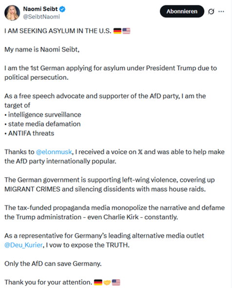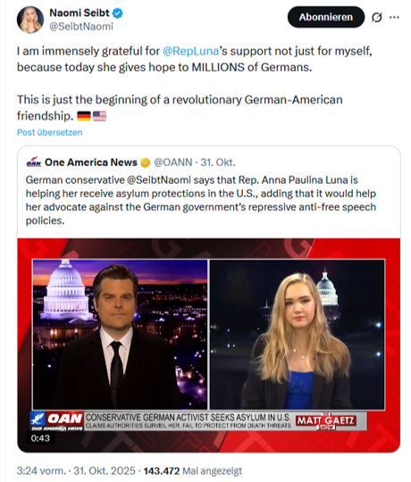 - „Rechte Aktivistin Naomi Seibt beantragt Asyl in den USA“ Deutschlandfunk (31. Oktober 2025)