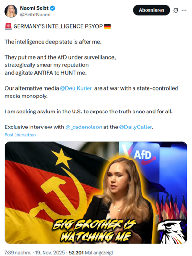- „Rechte Influencerin beantragte Asyl in den USA: Polizei ermittelt gegen Naomi Seibt wegen Volksverhetzung“ tagesspiegel (15. November 2025)