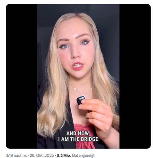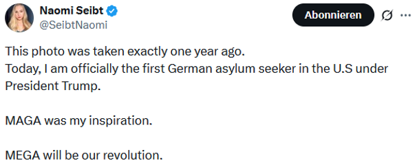 Und weil sich die Masche, „das Publikum emotional zu binden, ohne es inhaltlich zu überzeugen“ (Zeit), vielleicht doch mal abnutzen könnte, setzt die „rechte Influencerin“ noch eins drauf: als „die erste Deutsche, die unter Präsident Trump aufgrund politischer Verfolgung Asyl beantragt“: