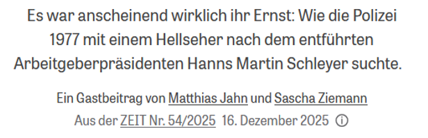 - Jahn, Matthias/Ziemann, Sascha „Entführung von Hanns Martin Schleyer: Wahn und Wahrheit“ zeit (16. Dezember 2025)