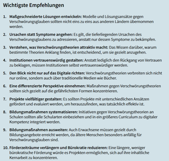 Fragwürdig erscheint indes die Empfehlung 9. Es gibt Studien, denen zufolge „ältere Menschen besonders anfällig für Verschwörungstheorien“ sind – aber auch genau gegenteilige Erkenntnisse und sogar die Auffassung, dass das Alter völlig unerheblich ist.
