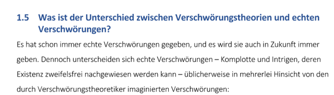 Bezeichnenderweise finden wir weder bei Foyle noch bei Schirrmeister auch nur ein einziges konkretes Beispiel für einen „Verschwörungsleugner“. Wir nehmen mal an: Weil so etwas gar nicht existiert. Kein Mensch auf dieser Welt „leugnet“ ernsthaft, dass es reale Verschwörungen, Komplotte, Intrigen, geheime Absprachen etc. gibt – mutmaßlich nicht mal ein Kindergartenkind.